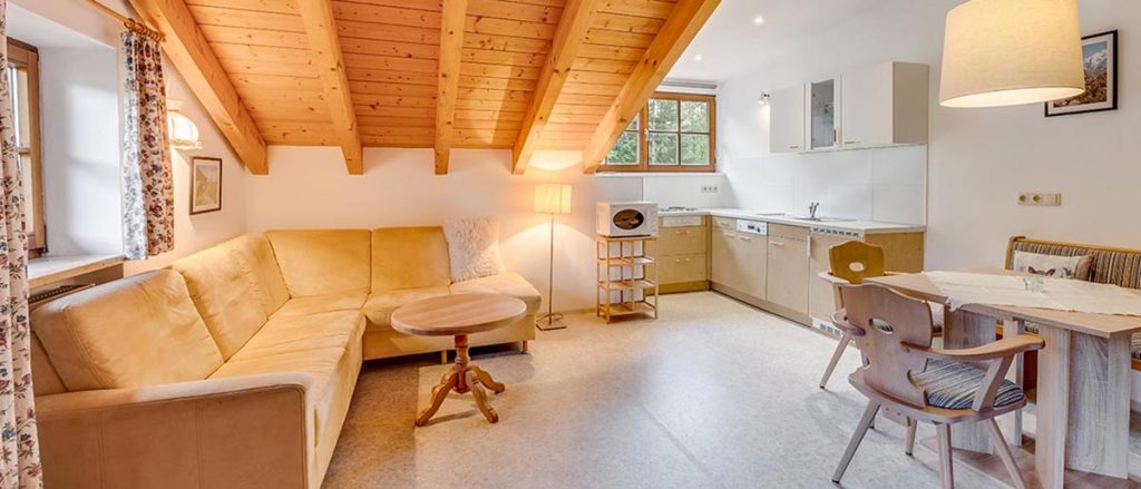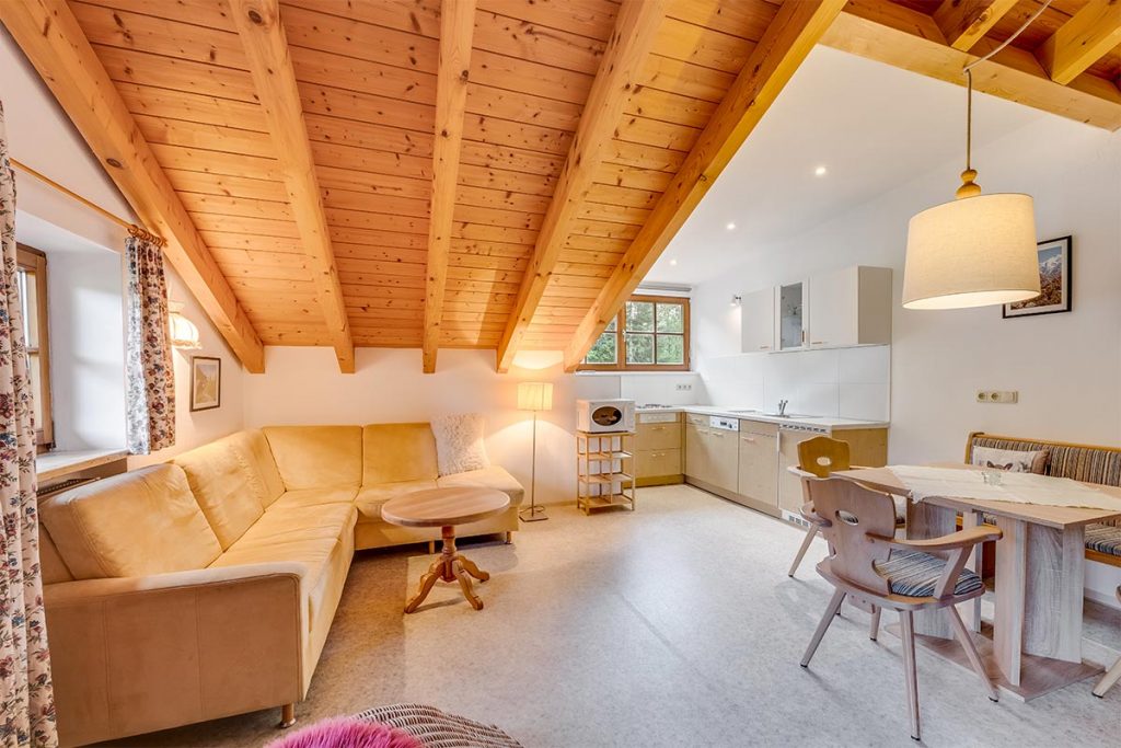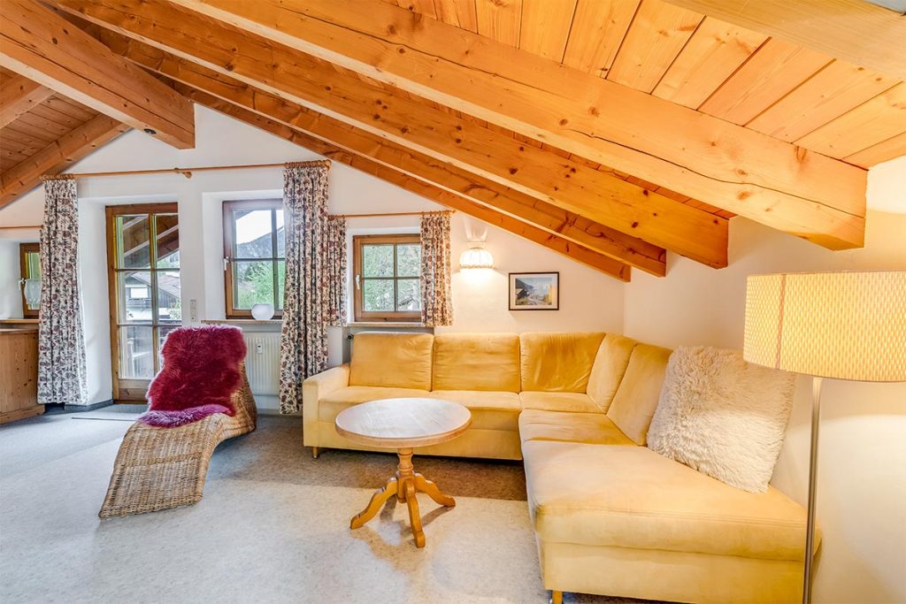 - Südseitiger Wohnbereich mit Eckcouchgarnitur und einem gemütlichen Essplatz mit Holzbank und Armlehnstühlen